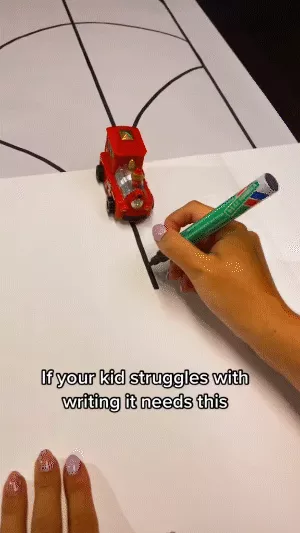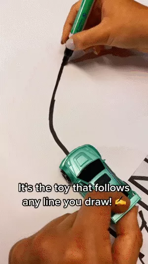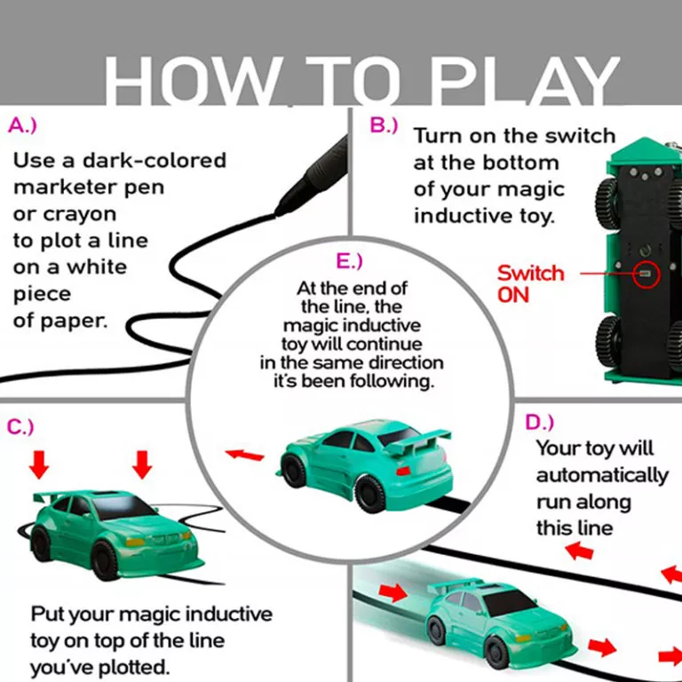 A little sensor under the bottom plate of the car does all of the magic.Simply draw a line with the included magic pen, put the car on that line and it will follow your stroke just magically.